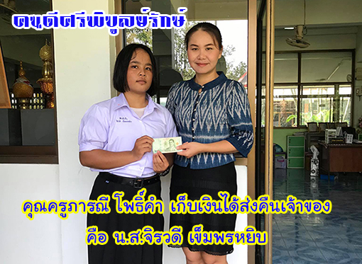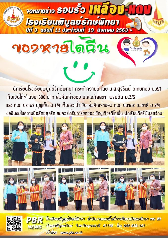 | นายจรัสธชัย เสิกภูเขียว ผู้อำนวยการโรงเรียนพิบูลย์รักษ์พิทยา ได้ส่งเสริม สนับสนุนครู บุคลากรทางการศึกษา และนักเรียนด้านคุณธรรมและความโปร่งใส ปลูกฝังจิตสำนึกให้มีความซื่อสัตย์สุจริต โปร่งใส และเป็นไปตามหลักธรรมาภิบาล โดยส่งเสริมให้มีโครงการของหายได้คืน |