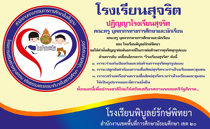 | นายจรัสธชัย เสิกภูเขียว ผู้อำนวยการโรงเรียนพิบูลย์รักษ์พิทยา ได้ส่งเสริม สนับสนุน พัฒนาครู บุคลากรทางการศึกษา และนักเรียนด้านคุณธรรมและความโปร่งใส ดังนี้ |